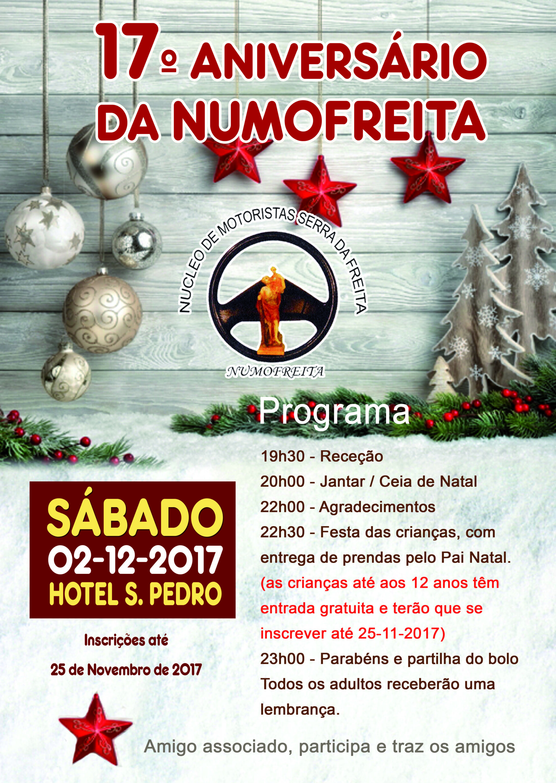 A Numofreita – Núcleo de Motoristas Serra da Freita, assinala este sábado, dia 2 de dezembro, o 17º aniversário. Para assinalar a data, a associação preparou um animado serão no Hotel S. Pedro. As inscrições terminaram no passado dia 25 de novembro.