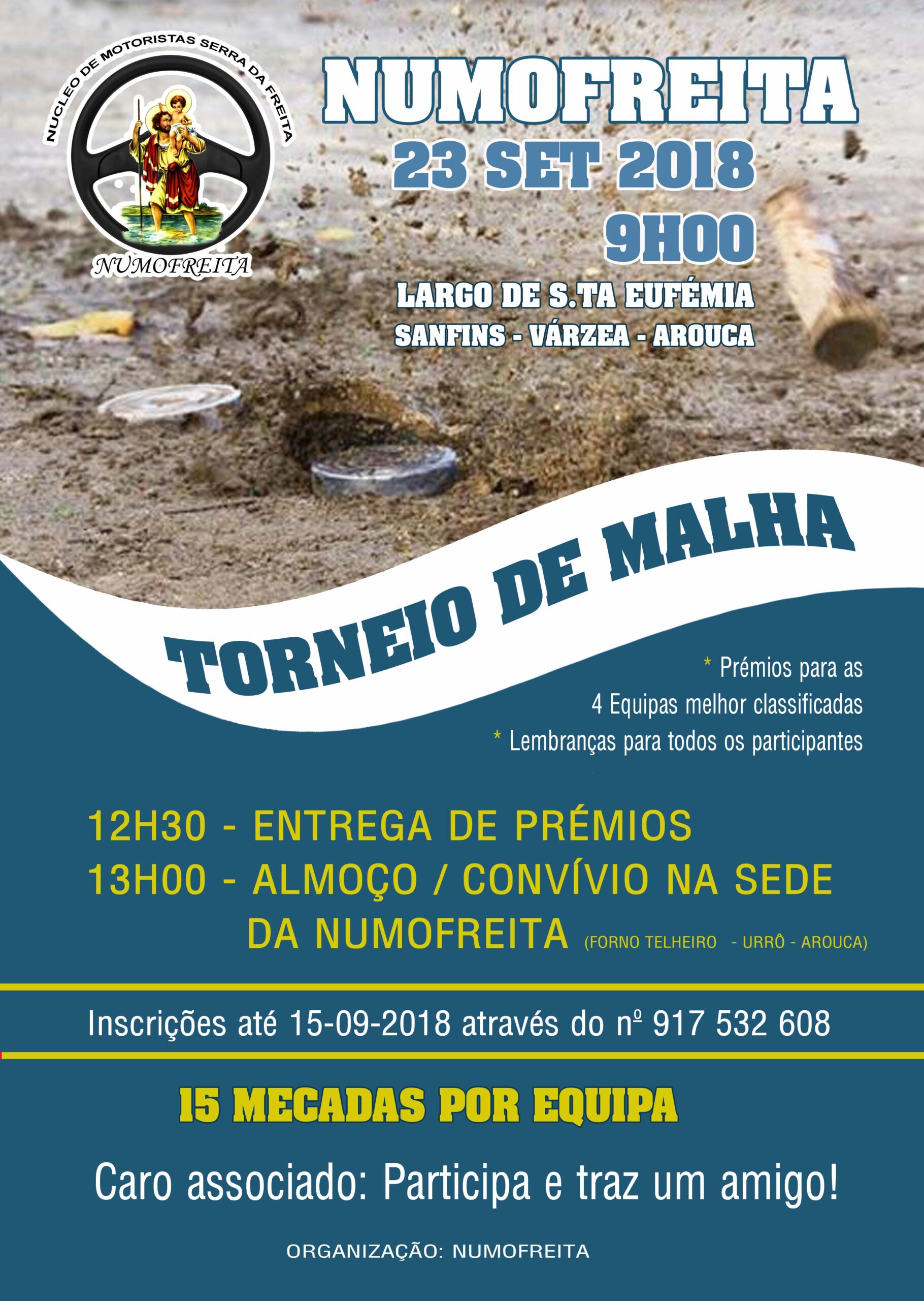 A Numofreita promove este domingo, dia 23 de setembro, no Largo de Santa Eufémia, lugar de Sanfins, freguesia de Várzea, concelho de Arouca, mais um Torneio de Malha. Pelas 12h30 decorrerá a entrega de prémios para as 4 equipas melhor classificadas e lembranças a todos os participantes. Às 13h00 terá início o almoço/convívio na sede da Numofreita, em Urrô.