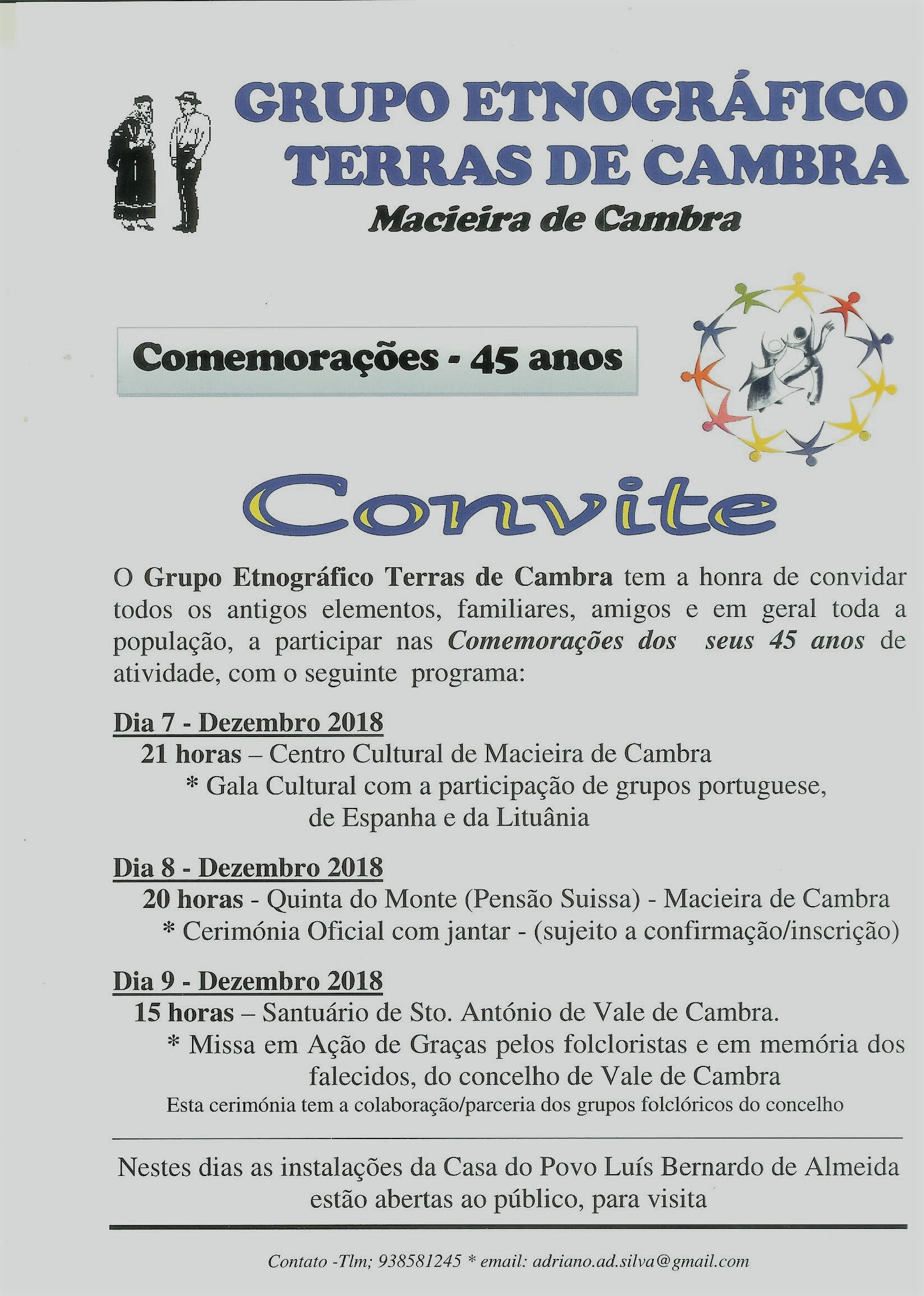 Nos dias 7, 8 e 9 de dezembro, o Grupo Etnográfico Terras de Cambra organiza um conjunto de atividades de comemoração dos 45 anos do grupo. Antigos elementos, familiares, amigos e público em geral estão convidados a participar nas comemorações. Fique com o programa.