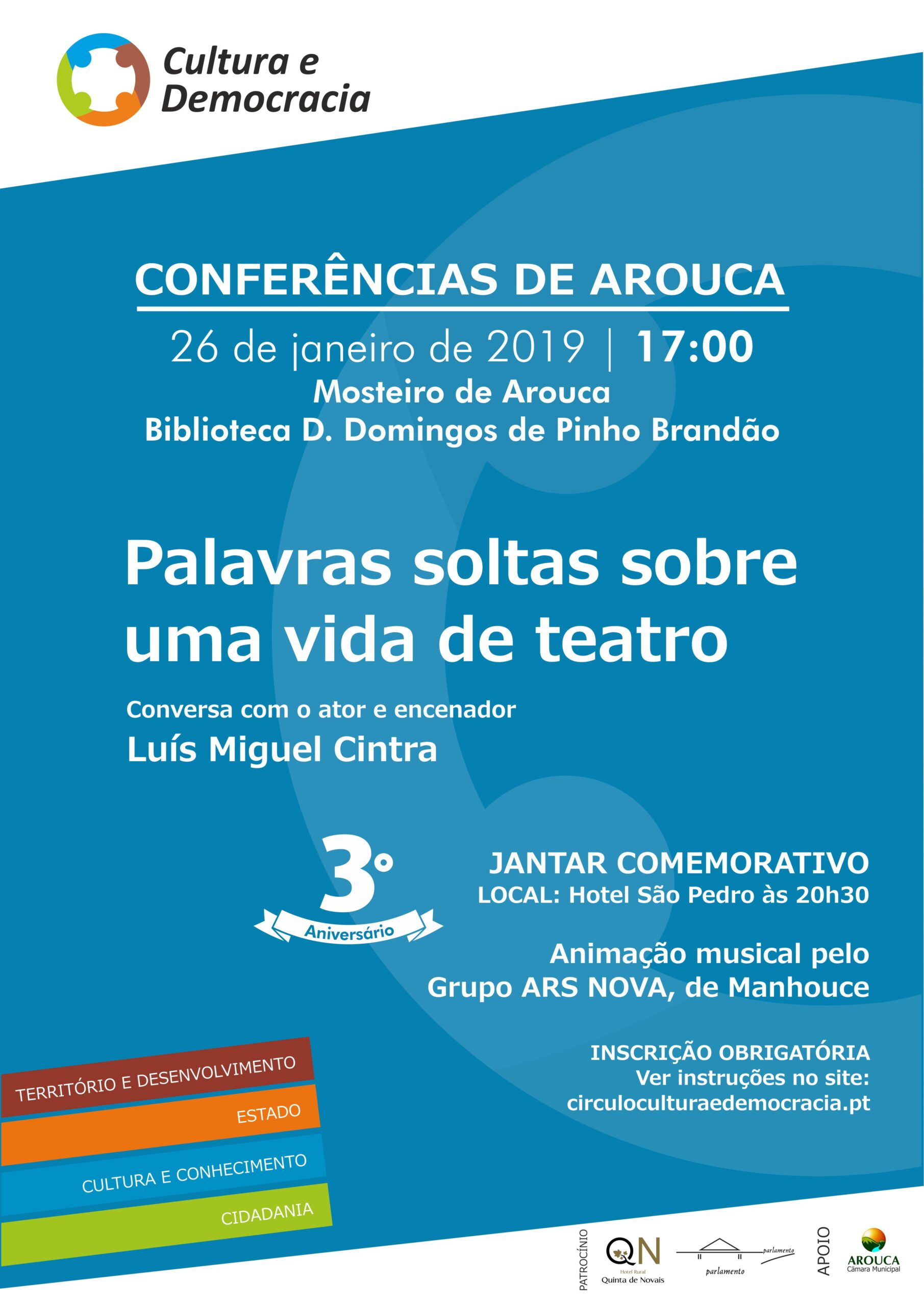 Janeiro marca o 3.º aniversário do Círculo Cultura e Democracia e amanhã, dia 26 não faltarão motivos para se juntar à celebração. Para assinalar a data, o Círculo apresenta mais uma “Conferência de Arouca” e promove um jantar com animação musical, havendo ainda lugar à renovação dos seus Órgãos Sociais.