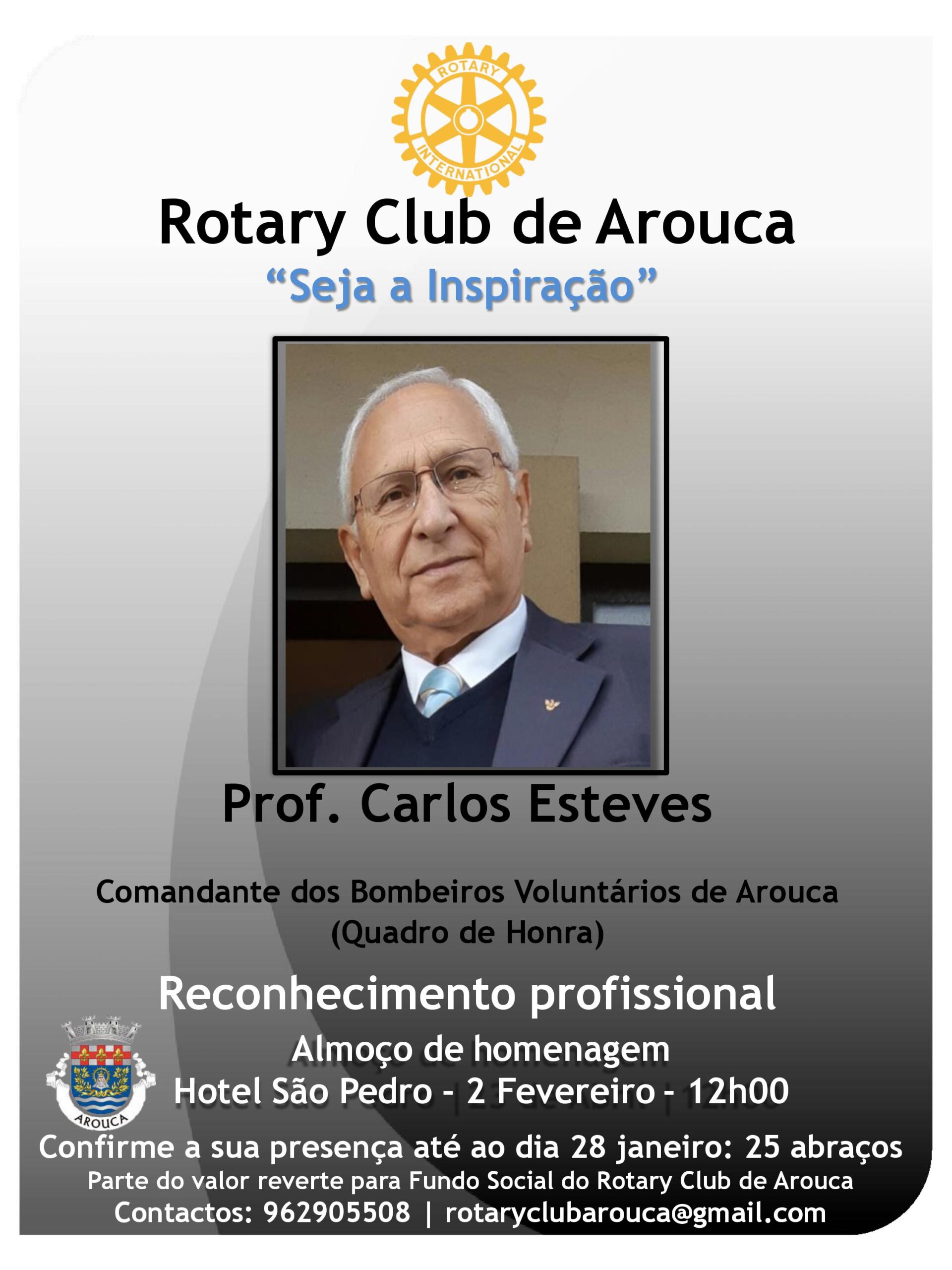 Todos os anos o Rotary Club de Arouca reconhece o mérito profissional a arouquenses que se destaquem na sua atividade. Este ano, na cerimónia agendada para 2 de fevereiro, é homenageado Carlos Esteves, docente, Quadro de Honra dos Bombeiros Voluntários, ex-autarca e até atleta. No seu currículo consta já uma Medalha de Mérito Municipal – Grau Ouro.