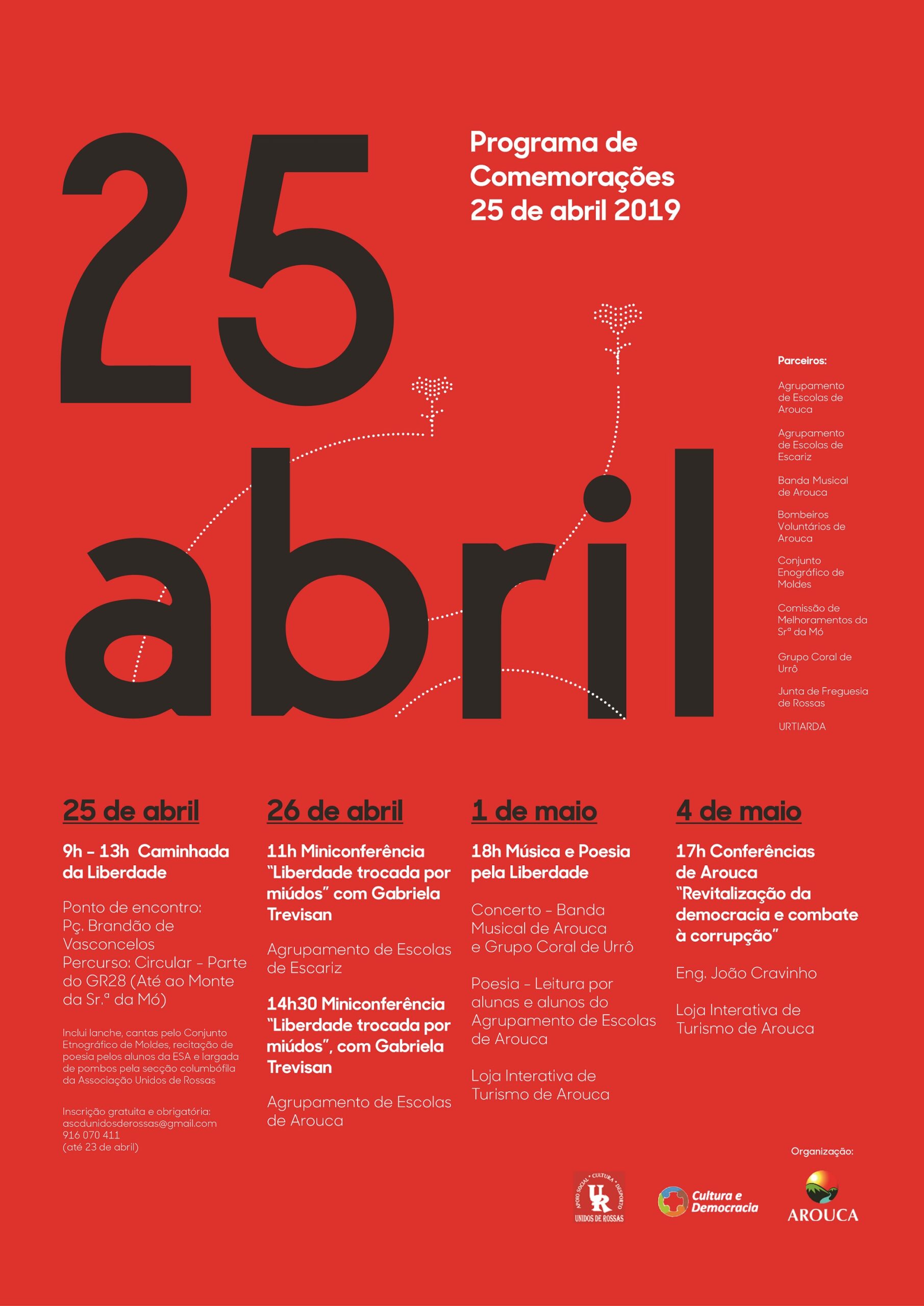 Arouca vai dedicar quatro dias às comemorações do 25 de Abril. A organização do evento pertence à Câmara de Arouca, associação “Unidos de Rossas” e a Círculo Cultura e Democracia com a participação de várias outras entidades e associações, nomeadamente Agrupamentos de Escolas de Arouca e Escariz, Bombeiros, Conjunto Etnográfico de Moldes, Comissão de Melhoramentos da Sr.ª da Mó e Grupo Coral de Urrô, a que se associam ainda a Junta de Rossas e Urtiarda.