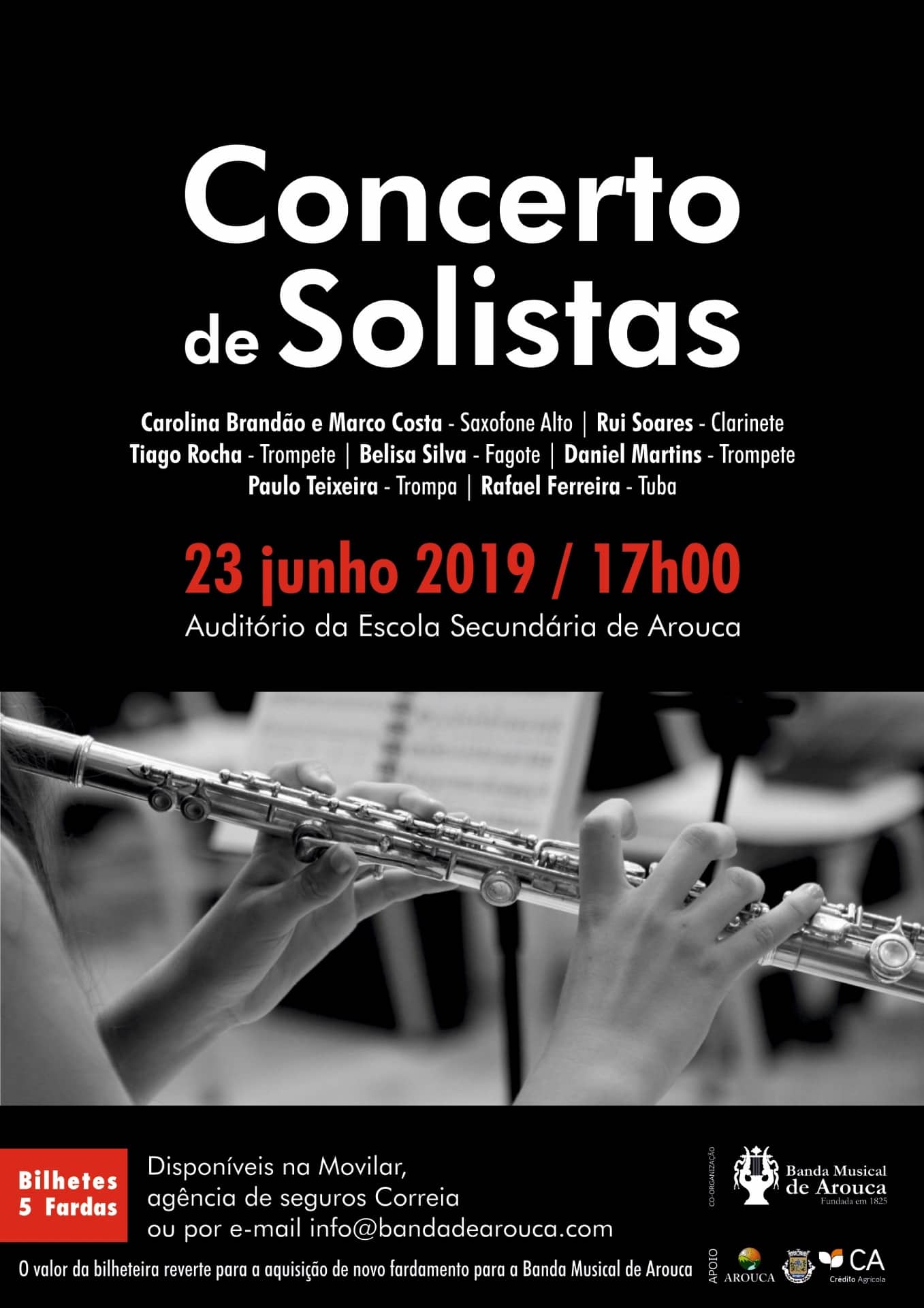 Este domingo, dia 23 de junho, a Banda Musical de Arouca vai apresentar a primeira edição do concerto de solistas, onde sete músicos da instituição (Carolina Brandão e Marco Costa – Saxofone Alto; Rui Soares – Clarinete; Tiago Rocha – Trompete; Belisa Silva – Fagote; Daniel Martins – Trompete; Paulo Teixeira – Trompa e Rafael Ferreira – Tuba) irão apresentar-se a solo, acompanhados pela Banda.