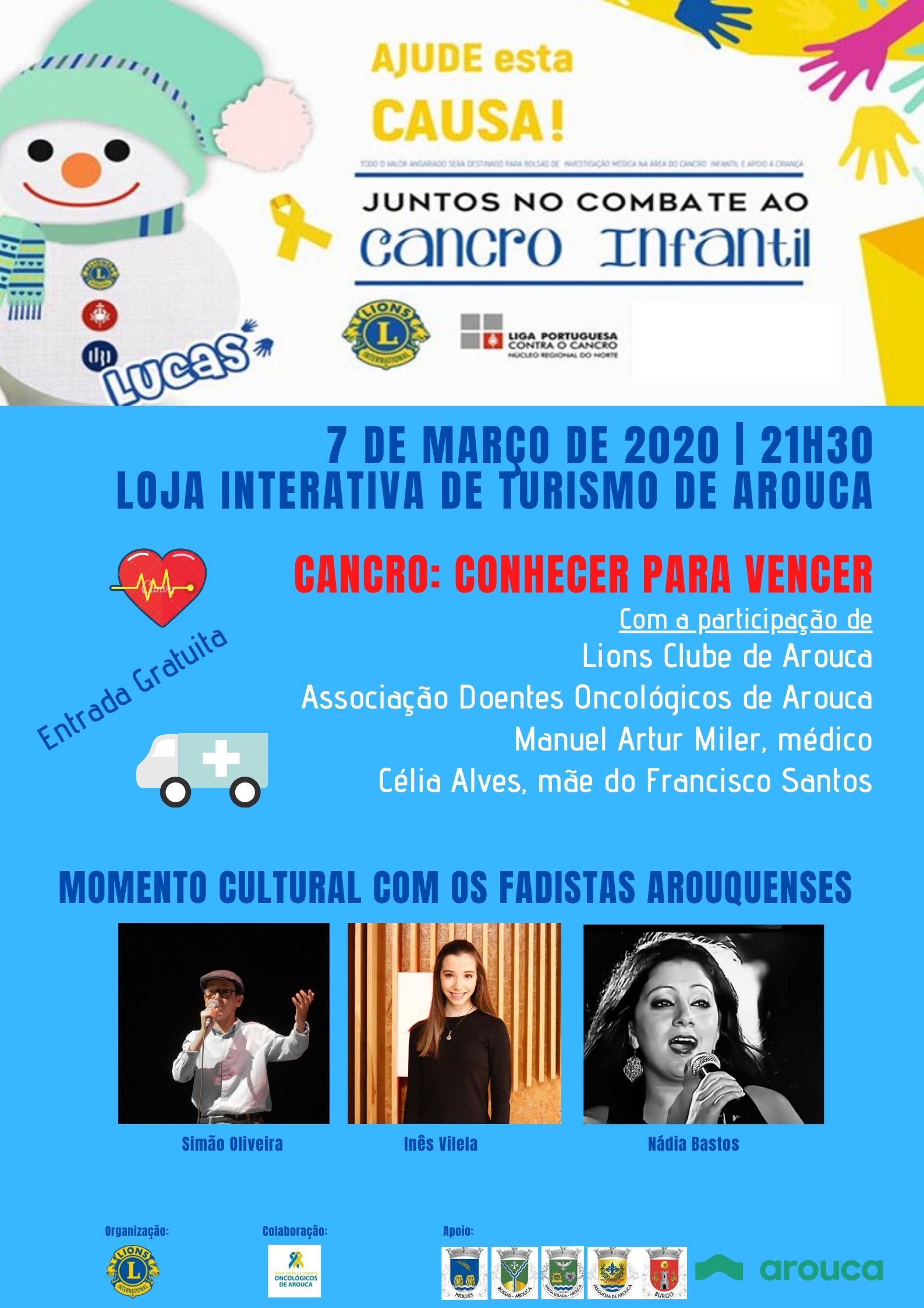 A iniciativa conta com os contributos do médico Manuel Artur Miler e de Célia Alves, mãe do Francisco Santos. Juntar-se-ão a estes a ADOA – Associação de Doentes Oncológicos de Arouca, dando testemunho da sua experiência a nível local e o Lions Clube de Arouca que divulgará o projeto solidário LUCAS.