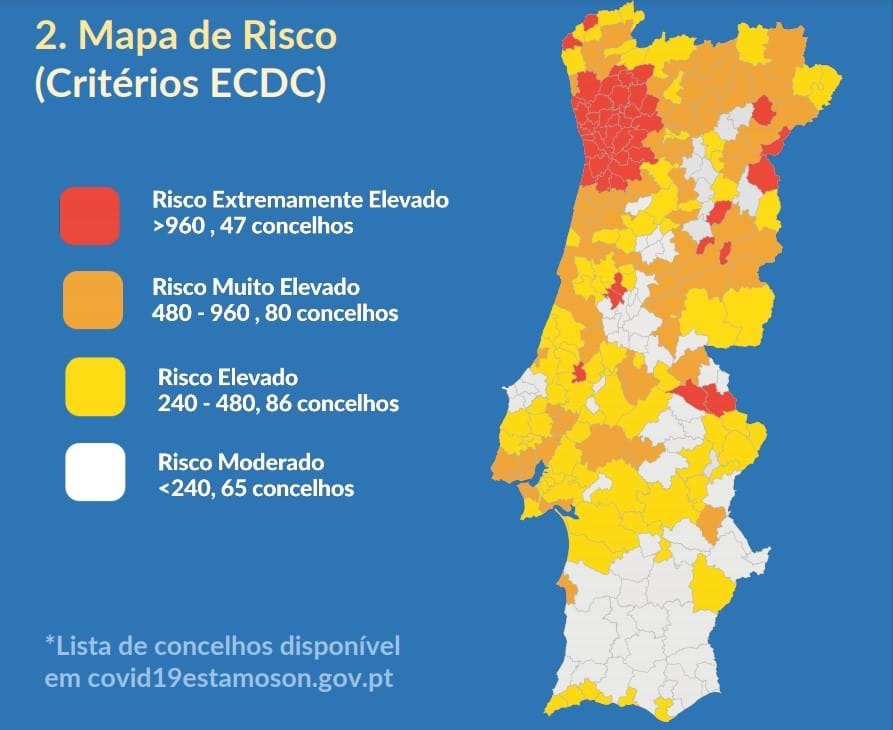 A classificação de risco é realizada de acordo com as categorias utilizadas pelo Centro Europeu de Prevenção e Controlo das Doenças, tendo por base a incidência de 240 casos por 100 mil habitantes.