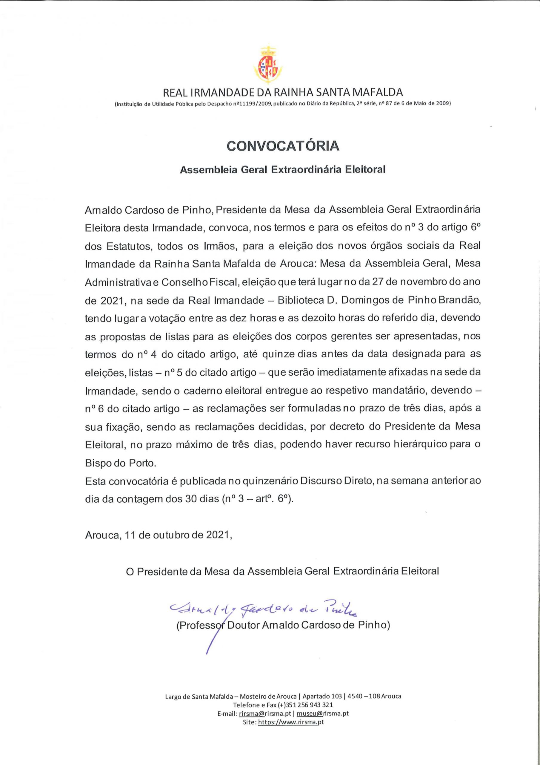 Convocatória da Assembleia Geral Eleitoral da Real Irmandade da Rainha Santa Mafalda de Arouca