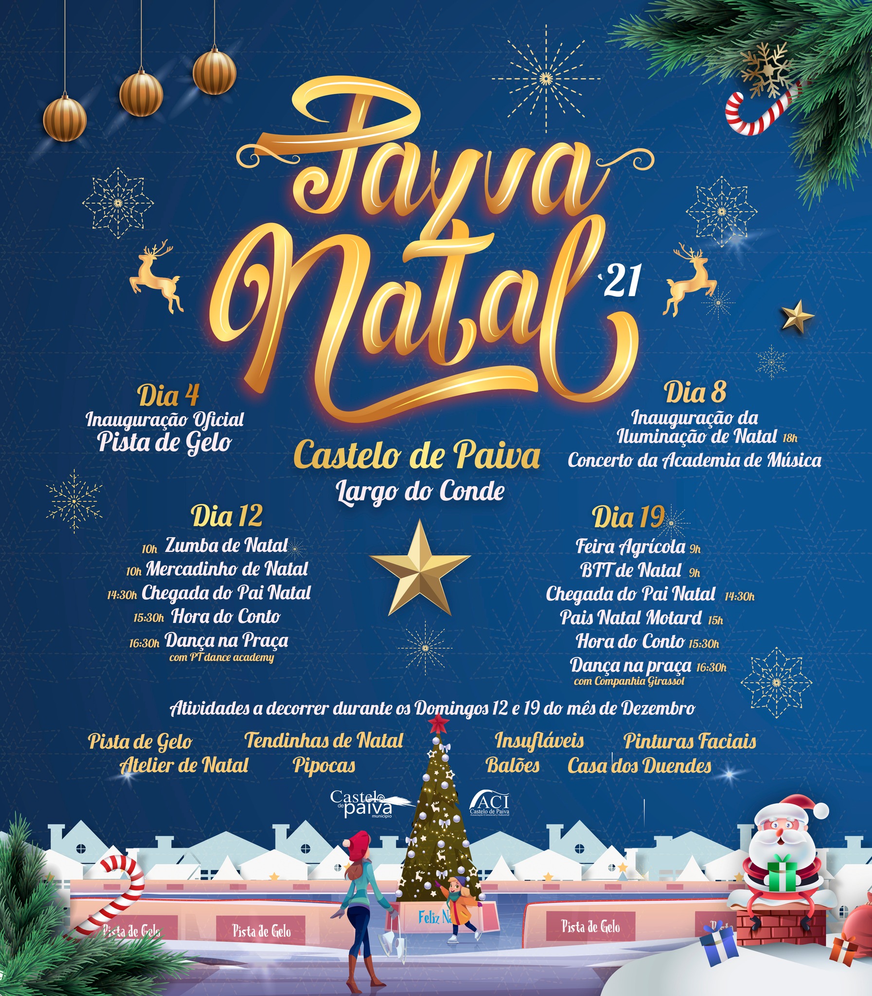 A festa do Natal é mais uma vez em Castelo de Paiva, e no próximo feriado, dia 4 de Dezembro, a autarquia vai promover a cerimónia de inauguração da Pista de Gelo, o grande atrativo da programação deste ano, seguindo-se no dia 8, a inauguração da iluminação de Natal, que será complementada com um concerto da Academia de Música, junto à Igreja Matriz, em jeito de abertura oficial do programa de animação natalícia, que se vai estender até ao dia 8 de Janeiro, com a realização de mais uma edição dos Cantares das Janeiras.