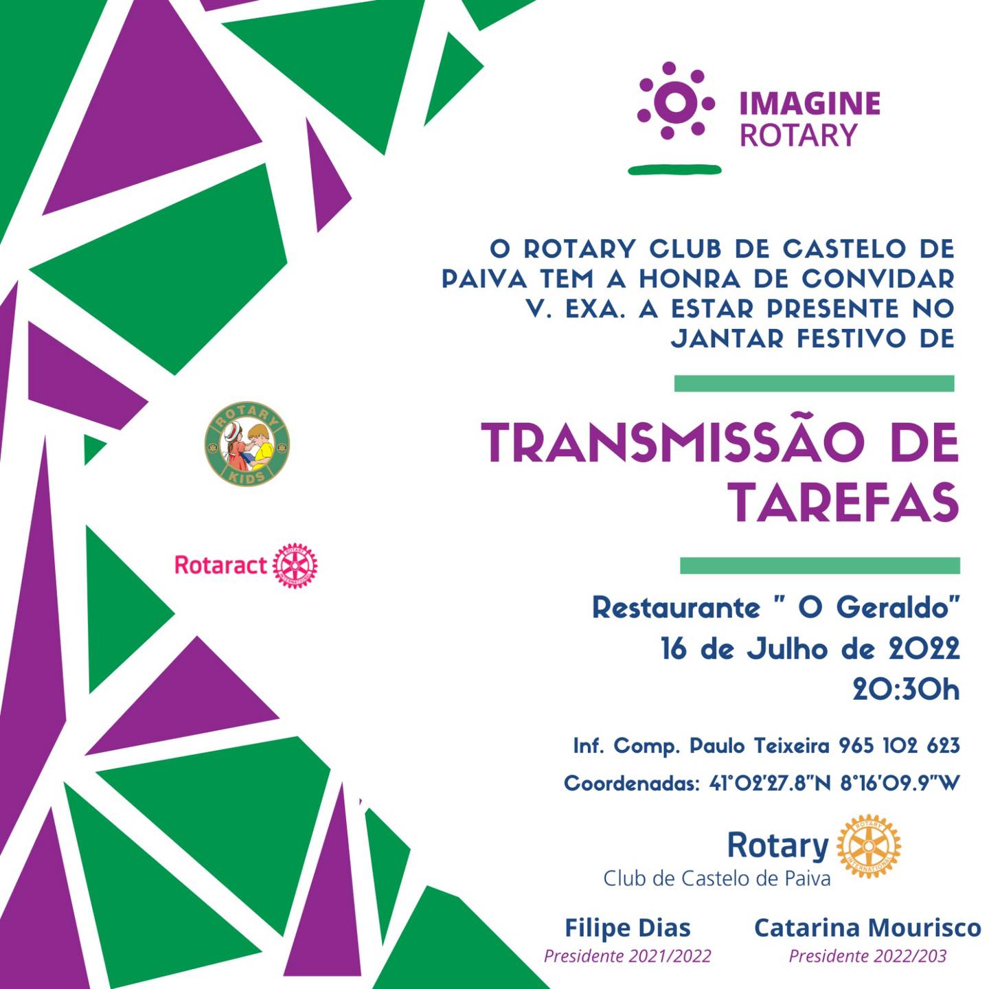 No próximo dia 16 de julho, o Rotary Clube de Castelo de Paiva irá fazer a transmissão de tarefas, onde a solicitadora Catarina Mourisco assumirá a presidência do clube paivense no ano de 2022/2023, sucedendo o atual presidente Filipe Dias.