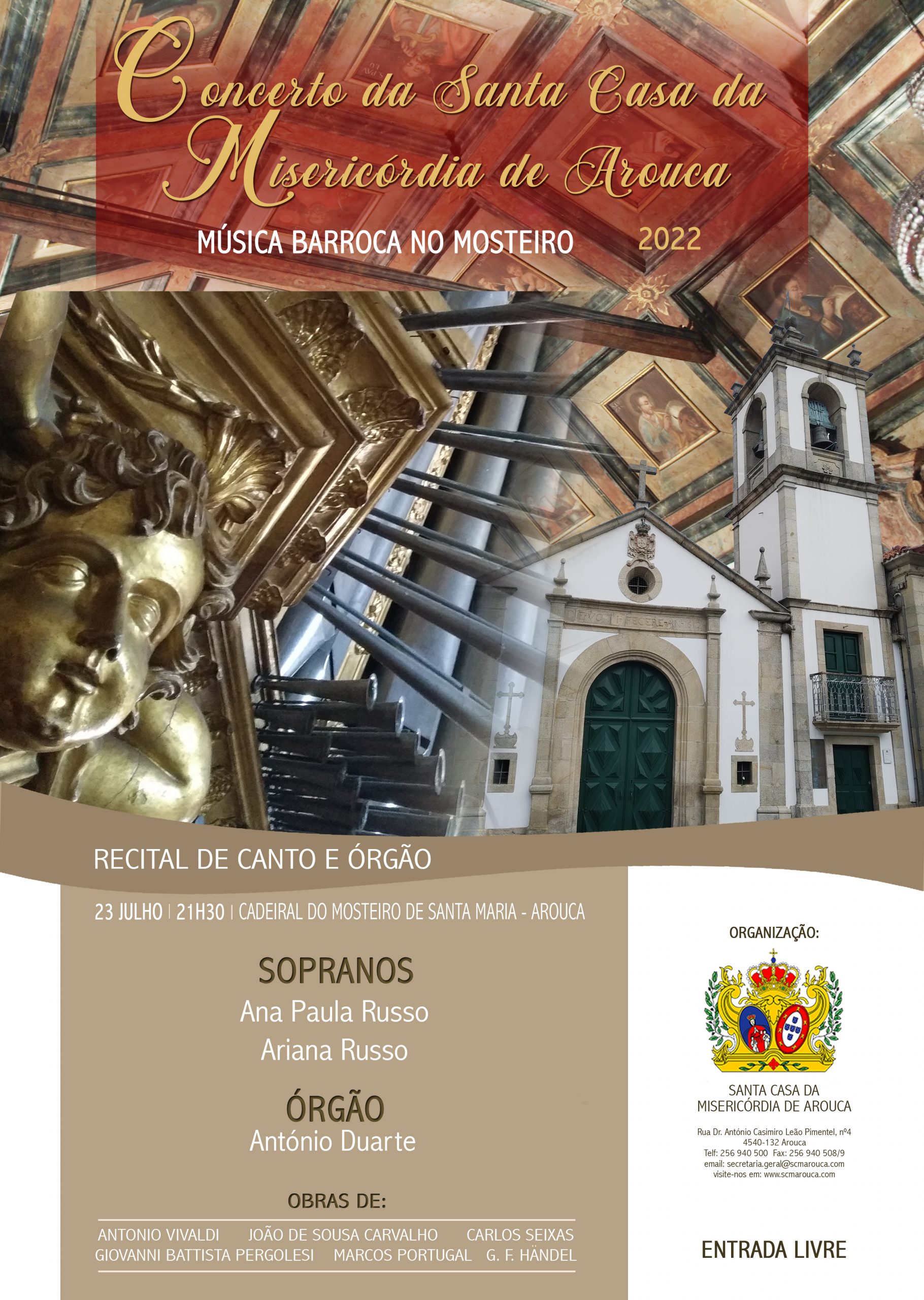 No próximo dia 23 de julho, pelas 21h30, a Santa Casa da Misericórdia de Arouca vai promover um concerto de Música Barroca no Cadeiral do Mosteiro de Santa Maria, em Arouca. O mesmo vai contar com a participação das Sopranos: Ana Paula Russo e Ariana Russo, do organista António Duarte, e direção artística de António Costa que vão interpretar obras de António Vivaldi, Giovanni Battista Pergolesi, João de Sousa Carvalho, Marcos Portugal, Carlos Seixas e G.F. Handel.