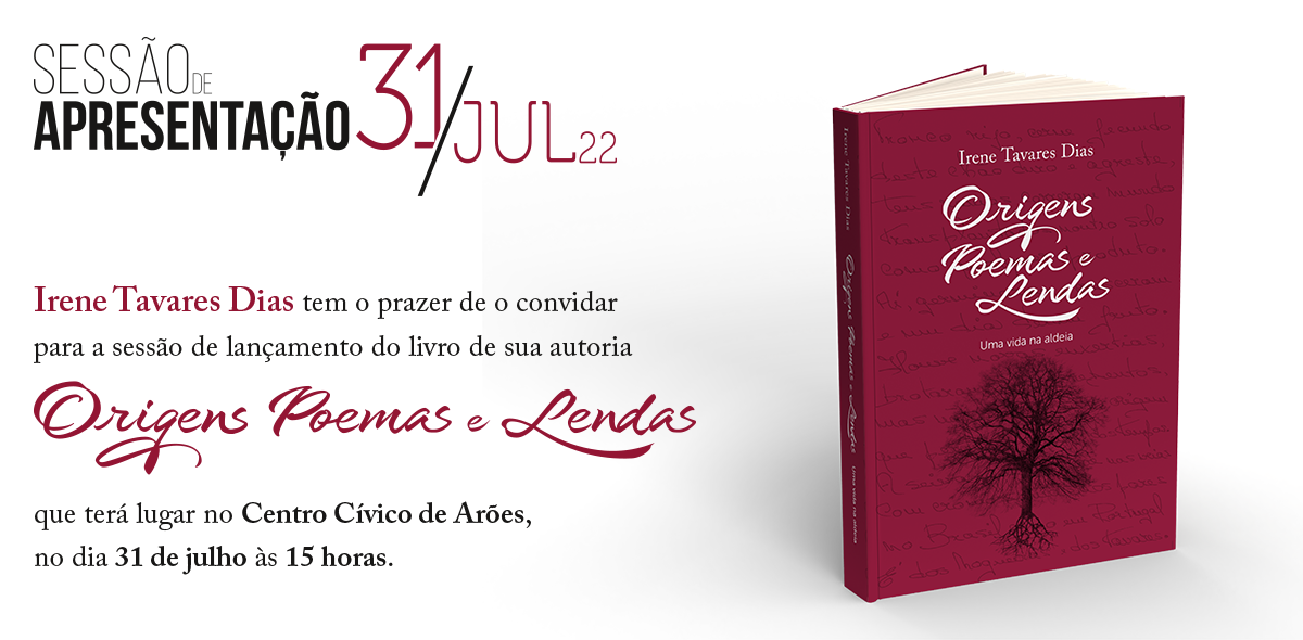 No próximo dia 31 de julho, domingo, pelas 15h, irá decorrer a apresentação do livro de Irene Tavares Dias, “Origens, Poemas e Lendas”, que terá como palco o Centro Cívico de Arões, Vale de Cambra. Será um encontro de Amigos, Cultura e Tradições.