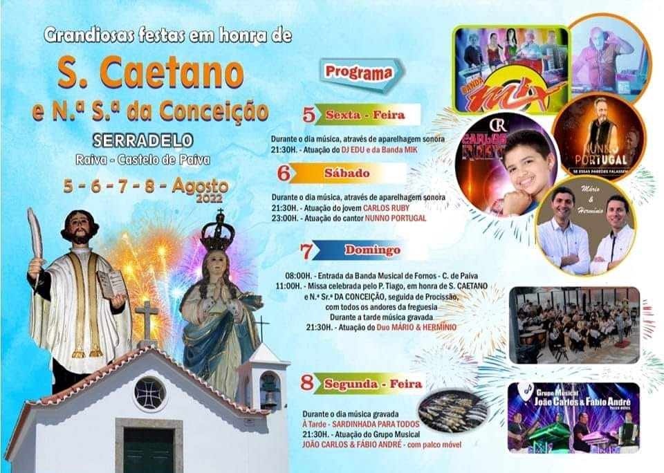 Em Serradelo, na freguesia da Raiva, as grandiosas festas em honra de S.Caetano e NªSª da Conceição decorrem de 5 a 8 de agosto. Regressam após dois anos, com início na sexta feira dia 5, com música gravada durante o dia e a atuação do DJ EDU e da Banda Mik pelas 21h30.
