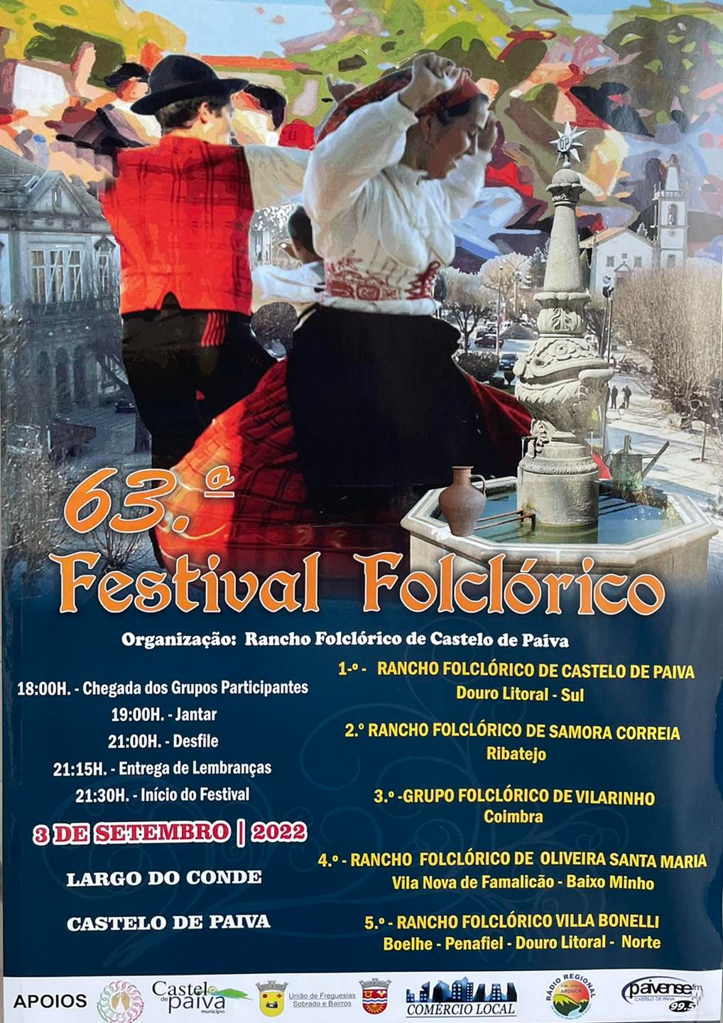 A organização é do Rancho Folclórico de Castelo de Paiva e vão participar 4 ranchos neste festival, para além do que organiza, como é o caso do Rancho Folclórico de Samora Correia do Ribatejo, o Grupo Folclórico de Vilarinho de Coimbra, o Rancho Folclórico de Oliveira Santa Maria de Vila Nova de Famalicão e ainda o Rancho Folclórico Villa Bonelli de Boelhe, Penafiel.