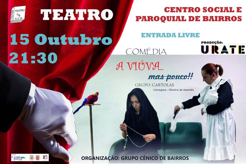 No próximo sábado dia 15 de outubro, pelas 21h30, decorre a peça de teatro “Viúva mas pouco”, do Grupo de Teatro “Cartolas”, organizado pelo Grupo Cénico de Bairros.