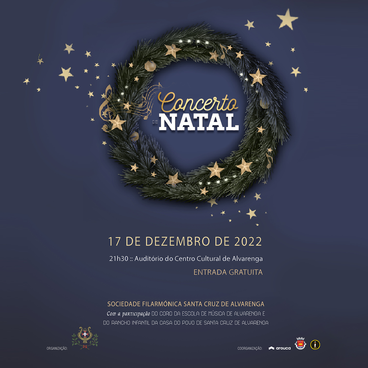 Acontece já no próximo sábado 17 de dezembro, pelas 21h30, um Concerto de Natal no auditório do Centro Cultural de Alvarenga, com a participação da Sociedade Filarmónica Santa Cruz de Alvarenga, do Coro da Escola de Música de Alvarenga e do Rancho Infantil da Casa do Povo de Santa Cruz de Alvarenga. A entrada é gratuita.