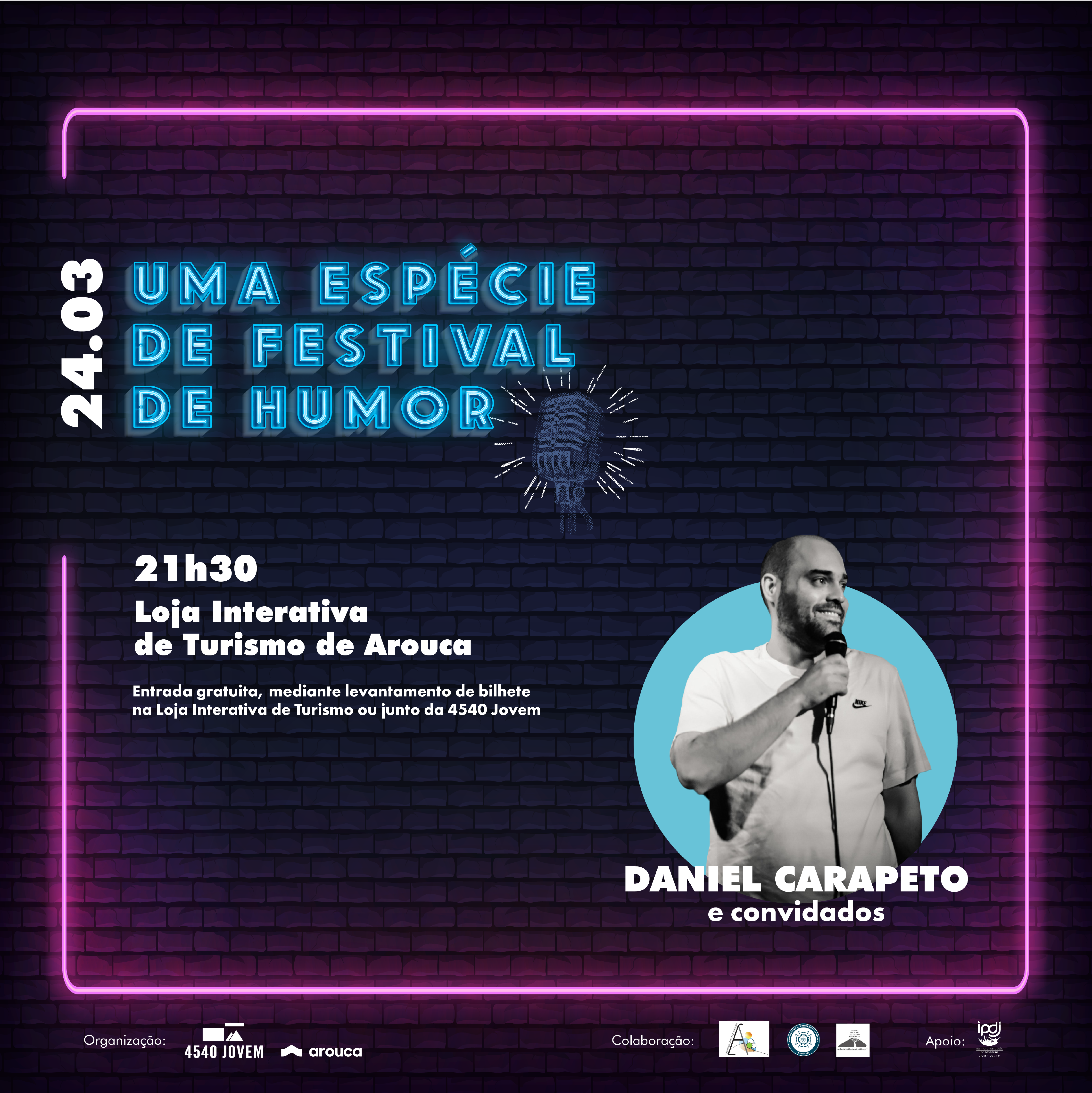 O humorista Daniel Carapeto é cabeça de cartaz desta primeira edição, que vai reunir coletividades locais, num espetáculo que promete ser “fora da caixa”. A entrada é gratuita e carece de bilhete, disponível na Loja Interativa de Turismo, ou junto dos elementos da 4540 Jovem.