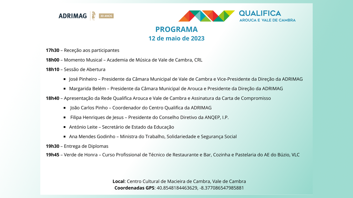 No próximo dia 12 de maio será oficializada a constituição da Rede Qualifica AROUCA e VALE DE CAMBRA, através da assinatura da Carta de Compromisso por todos os elementos constituintes da Rede. A cerimónia decorrerá em no Centro Cultural de Macieira de Cambra, Vale de Cambra, pelas 18h00.