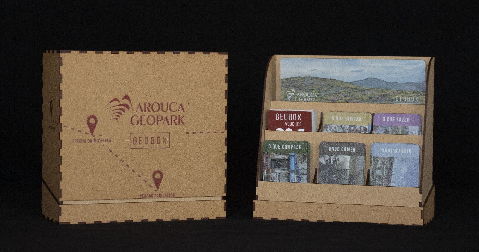 Esta caixa-oferta tem vales e vouchers de diferentes valores, que podem ser usados em serviços e produtos de empresas parceiras aderentes. Também incluído na Geobox está uma apresentação do território, termos e condições de utilização, e um cartão promocional de cada um dos parceiros.