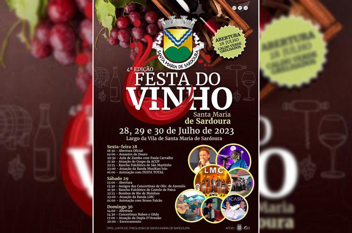 No próximo fim de semana, de 28 a 30 de julho, a Junta de Freguesia de Santa Maria de Sardoura vai promover a 4.ª Edição da Festa do Vinho, Gastronomia e Atividades. O evento vai decorrer no Largo do Fundo do Adro e vai contar com expositores locais, animação e música ao longo de 3 dias.