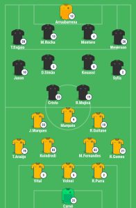 Valido (GR), R.Fernandes, Milovanov (DF), P.Santos (MD) Bukia, Michel, Trezza, Lawal, Puche (AT)