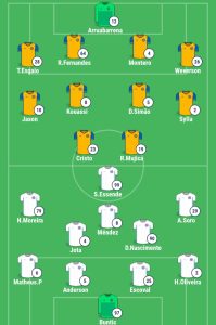 70 – Saem R.Fernandes, Kouassi e Sylla, entram M.Rocha, Busquets e Lawal