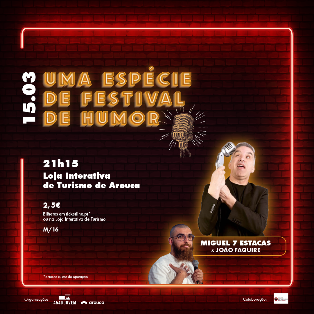 A 4540 Jovem e o Município de Arouca promovem a 2ª edição de “Uma espécie de Festival de Humor”, um evento que apresenta várias atividades tendo como ponto central o humor, e que culmina num espetáculo, a 15 de março, pelas 21h15, na Loja Interativa de Turismo. O humorista Miguel Sete Estacas é cabeça de cartaz, numa noite que terá, ainda, as atuações do João Faquire (também humorista), e do Teatro Experimental de Arouca. A entrada terá o custo de 2,5€, e os bilhetes estão disponíveis em ticketline.pt, ou na Loja Interativa de Turismo.