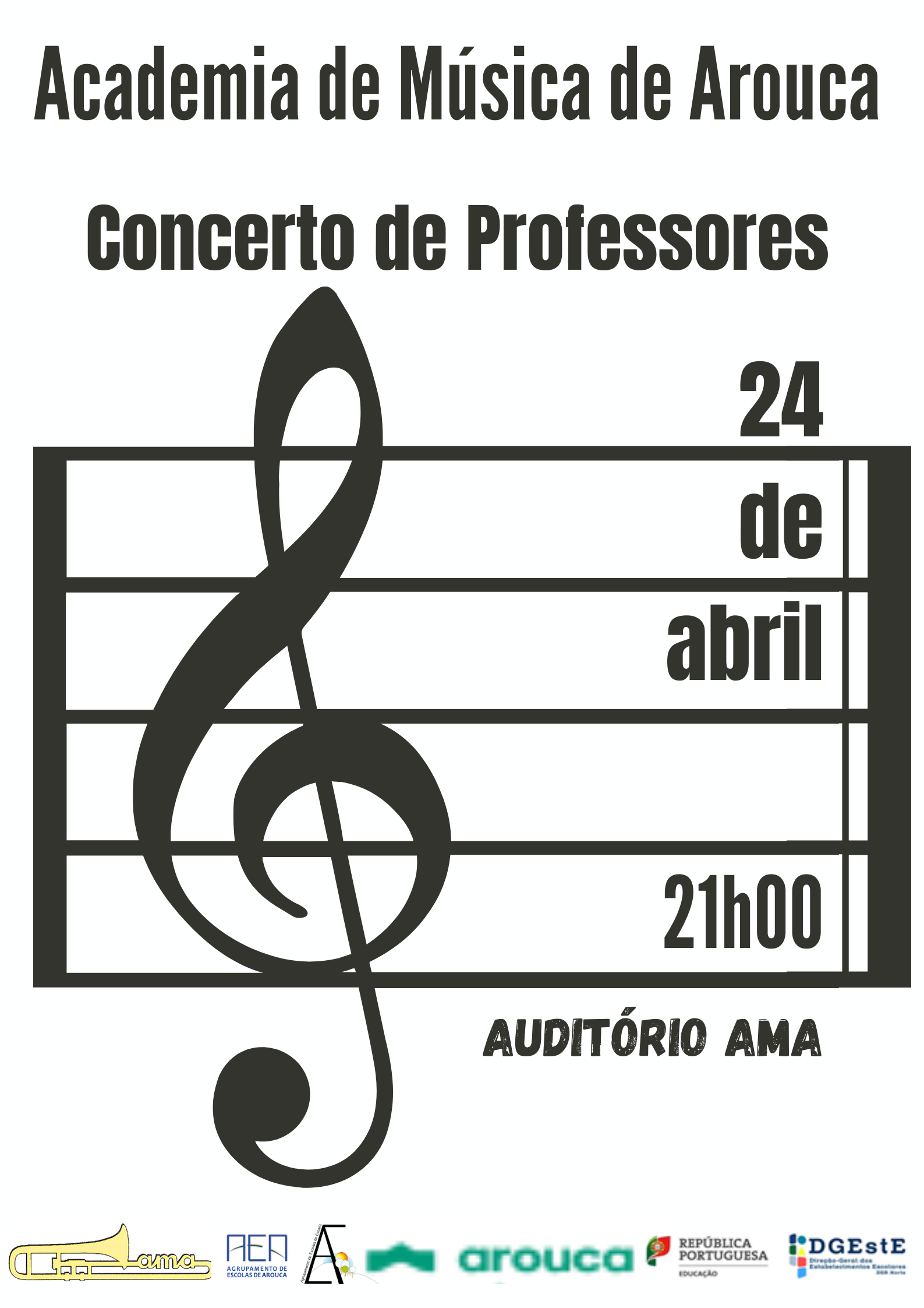 A Academia de Música de Arouca vai realizar um Concerto dos Professores dessa Instituição no próximo dia 24 de abril. O evento vai-se realizar no Auditório da Academia de Música de Arouca, no Edifício da Escola Básica-Bloco C (entrada pela Travessa da Corredoura), pelas 21h00.