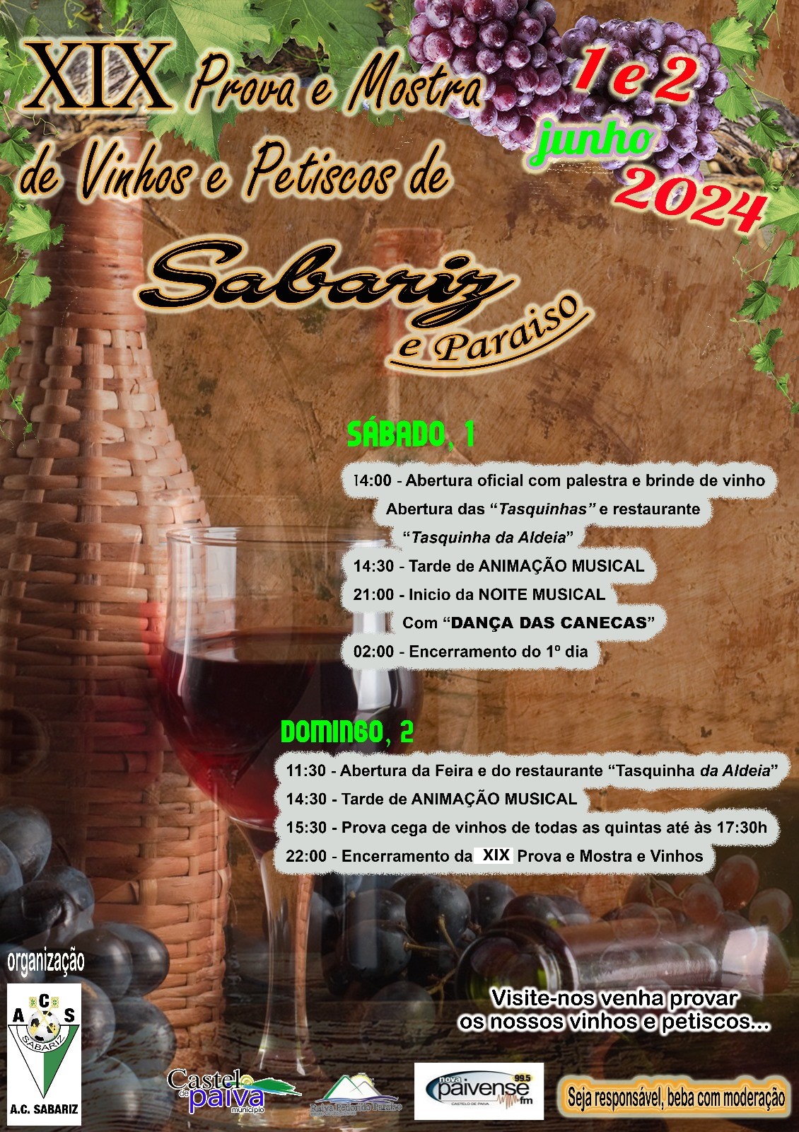 Com organização a cargo da Associação Cultural de Sabariz, realiza-se no próximo fim de semana, no principal largo daquela localidade da freguesia de S. Pedro do Paraíso, a XIX Mostra de Vinhos e Petiscos, um evento que volta a contar com o apoio da CM de Castelo de Paiva e da União de Freguesias de Raiva, Pedorido e Paraíso.