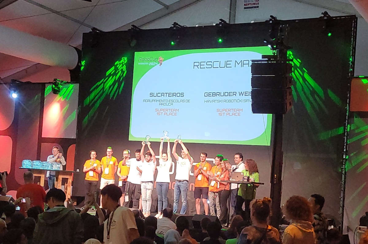 Paulo Pinto e Gonçalo Santos, do 12º ano do curso profissional de Técnico de Eletrónica e Telecomunicações, tendo Sérgio Postilhão como professor e mentor, conquistaram o 1º prémio na categoria Rescue aze Teams, no RoboCup 2024, que se realizou em Eindhoven, nos Países Baixos.