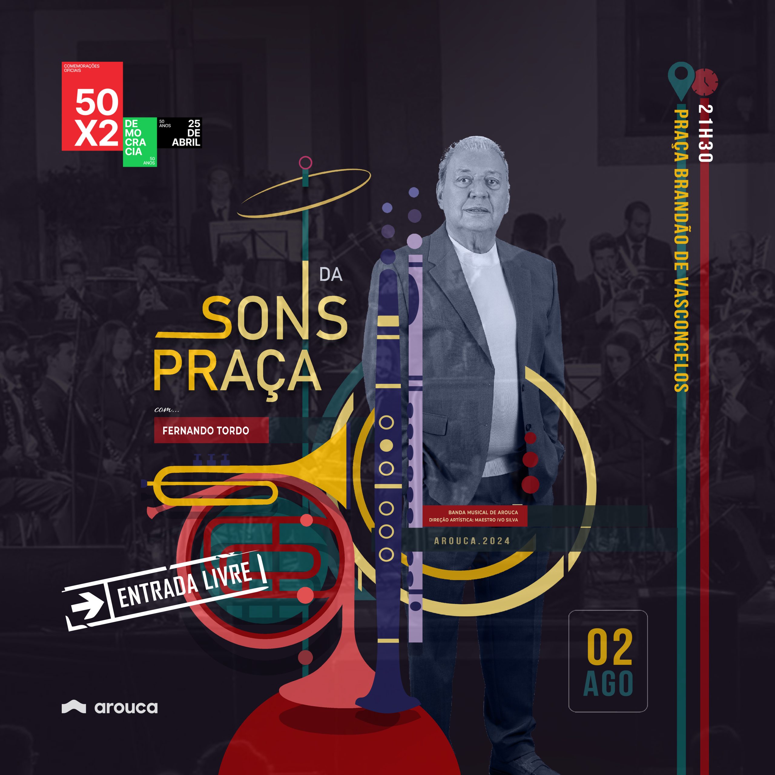 Irá decorrer na sexta-feira, dia 2 de agosto, pelas 21h30, o concerto “Sons da Praça”, na Praça Brandão de Vasconcelos, onde Fernando Tordo atuará acompanhado pela Banda Musical de Arouca.