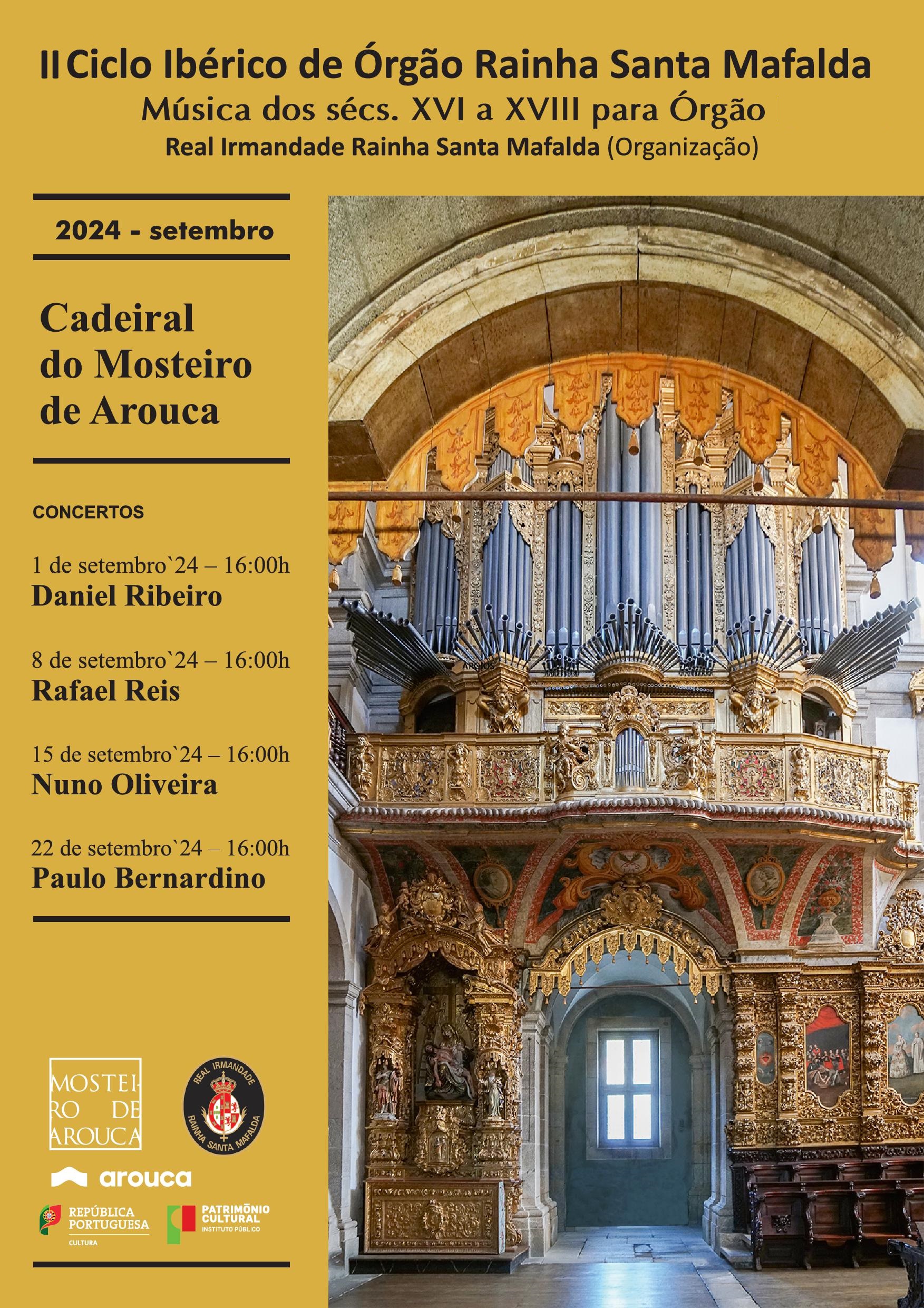 Organizado pela Real Irmandade da Rainha Santa Mafalda, irá decorrer, no mês de setembro, o II Ciclo Ibérico de Órgão Rainha Santa Mafalda composto por quatro concertos de órgão com música dos séculos XVI a XVIII, que terão lugar no cadeiral do Mosteiro de Arouca.