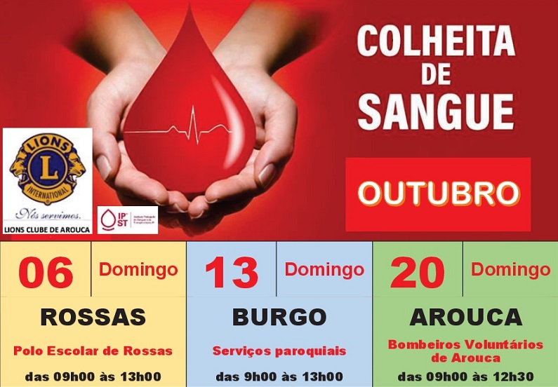 O Lions Clube de Arouca está a promover 3 dádivas de sangue, que irão decorrer ao domingo, nos dias 6, 13 e 20 de outubro, no Pólo Escolar de Rossas, nos Serviços Paroquiais do Burgo, e na sede dos Bombeiros Voluntários de Arouca, respetivamente.