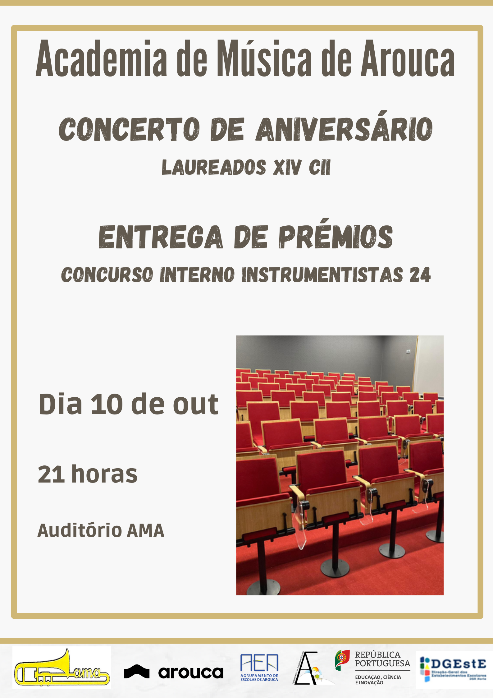 Irá decorrer no dia 10 de outubro, pelas 21h00, o concerto de comemoração do aniversário da Academia de Música de Arouca. Intitulado de Concerto de Laureados XIV Concurso Interno Instrumentistas 24, será feita a entrega de prémios deste mesmo concurso no decorrer deste evento, que terá lugar no auditório da Academia de Música de Arouca.