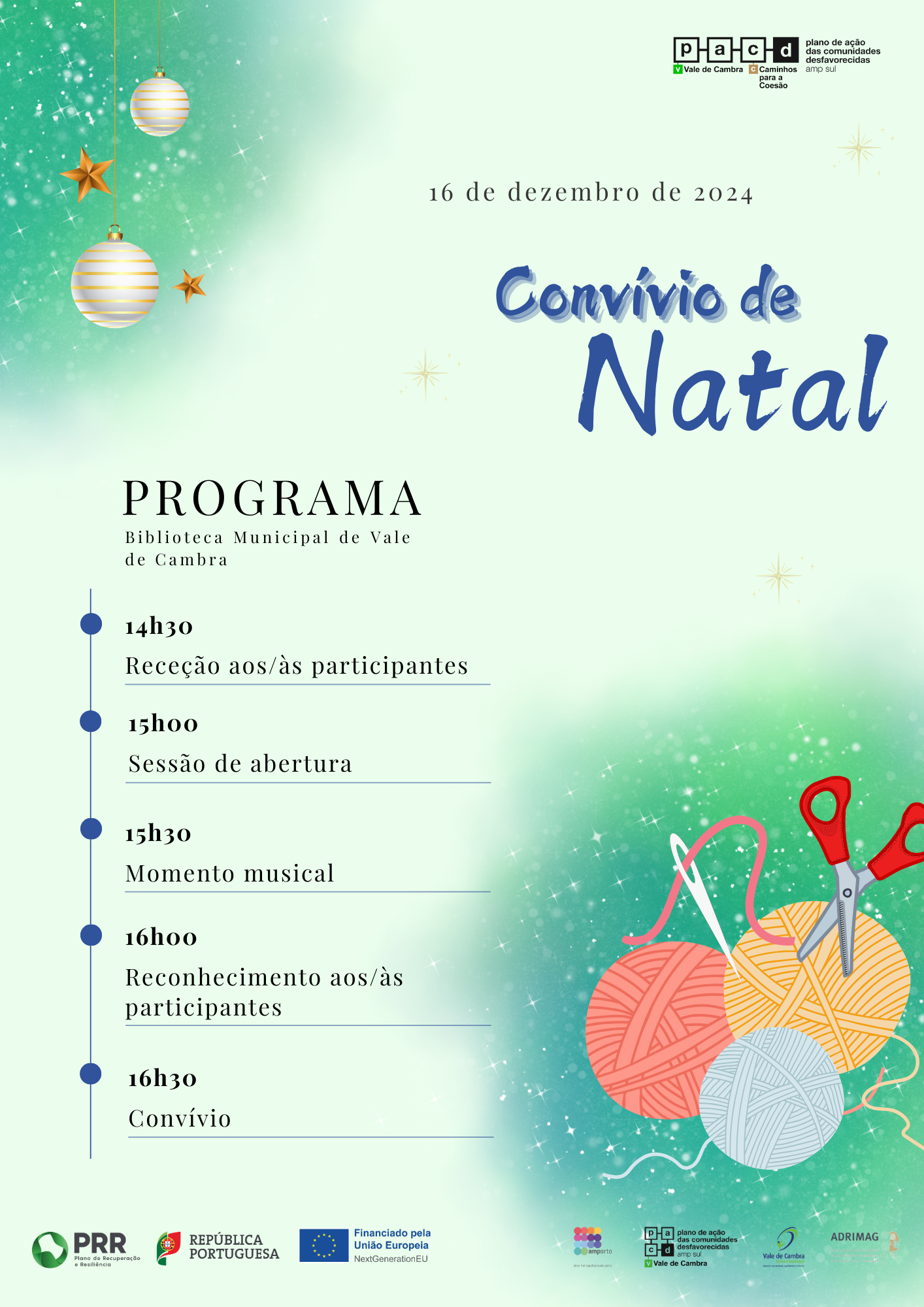 No âmbito do projeto Caminhos para a Coesão, promovido pela Câmara Municipal de Vale de Cambra e operacionalizado pela ADRIMAG, no contexto do Plano de Ação das Comunidades Desfavorecidas (PACD) AMP-Sul, estas entidades vão promover, no dia 16 de dezembro, na Biblioteca Municipal, pelas 14h30, uma ação que a equipa do Projeto designa por “Convívio Social”. A iniciativa pretende “acima de tudo reconhecer os trabalhos elaborados pelas utentes” do projeto “ao longo do ano”, como referiu em nota de imprensa a autarquia.