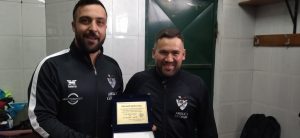 Hugo Amaral, presidente do Vila, entrega a Fábio Jesus a placa dos seus 50 jogos