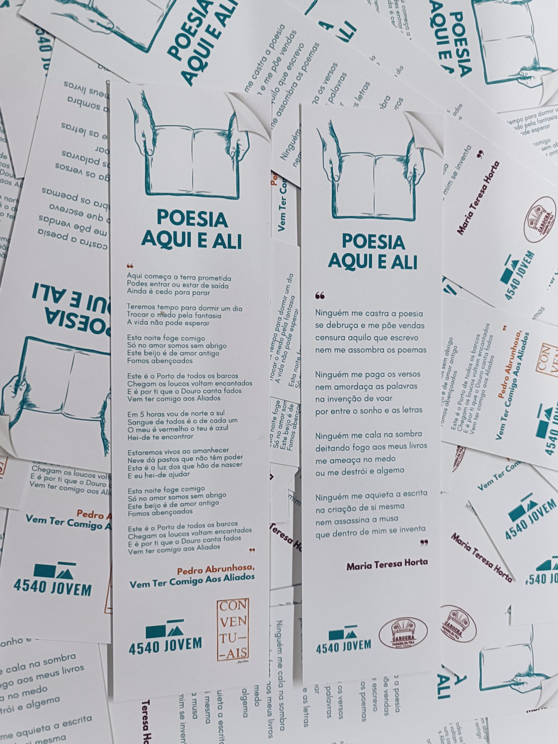 No âmbito das comemorações do Dia Mundial da Poesia, que se celebra a 21 de março, a associação 4540 Jovem promove a iniciativa «Poesia Aqui e Ali» que visa aproximar a poesia do quotidiano da comunidade. Em parceria com a Padaria e Pastelaria Carocha e os Doces Conventuais de Arouca – pelas mãos de Jorge Bastos, serão distribuídos gratuitamente marcadores de livros com dois poemas emblemáticos da literatura portuguesa.