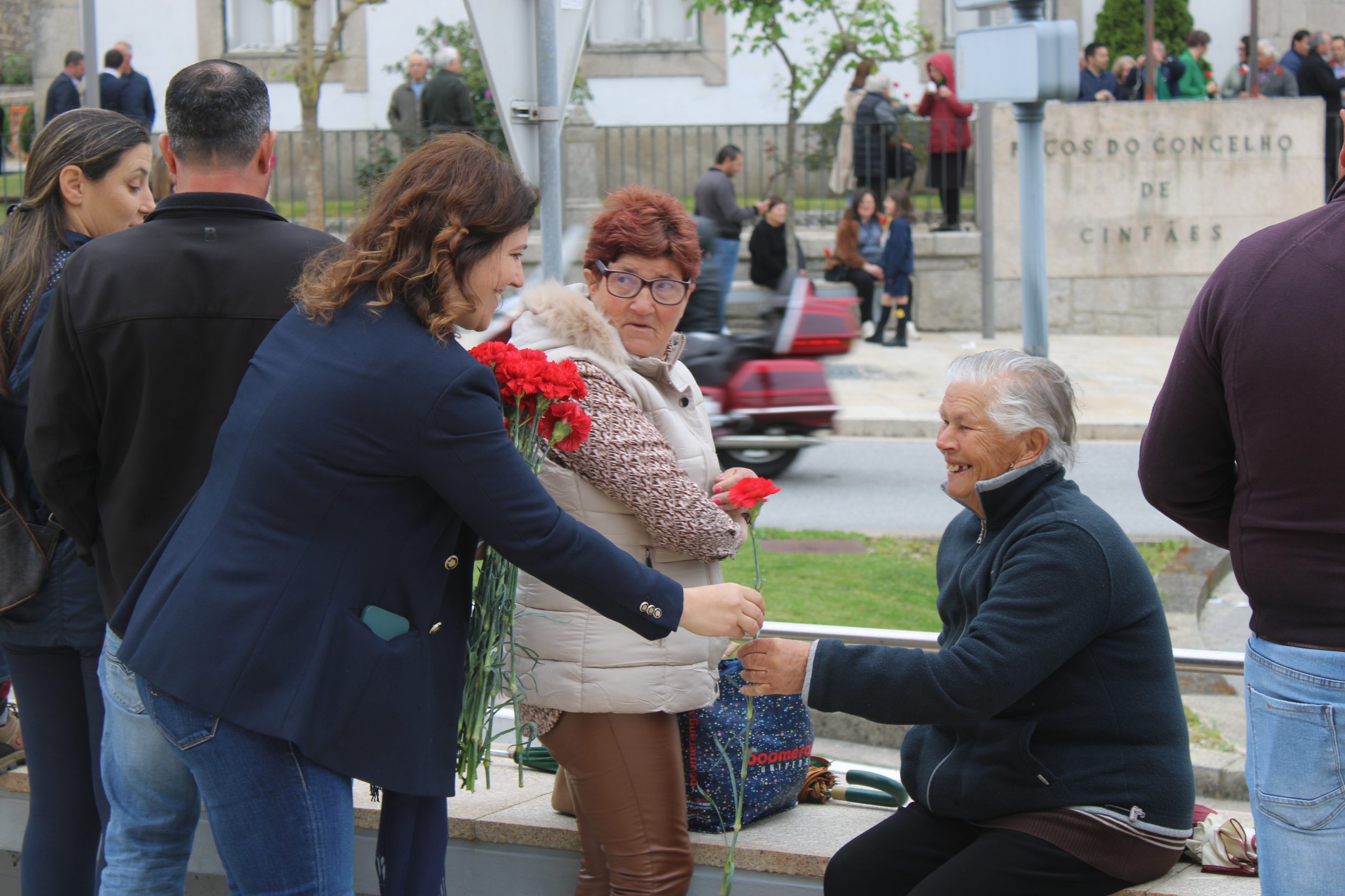 Em tradição recuperada, foram distribuídos cravos vermelhos à população – símbolo maior da revolução e homenagem a Celeste Caeiro, a “Mulher dos Cravos”, que faleceu em novembro de 2024.