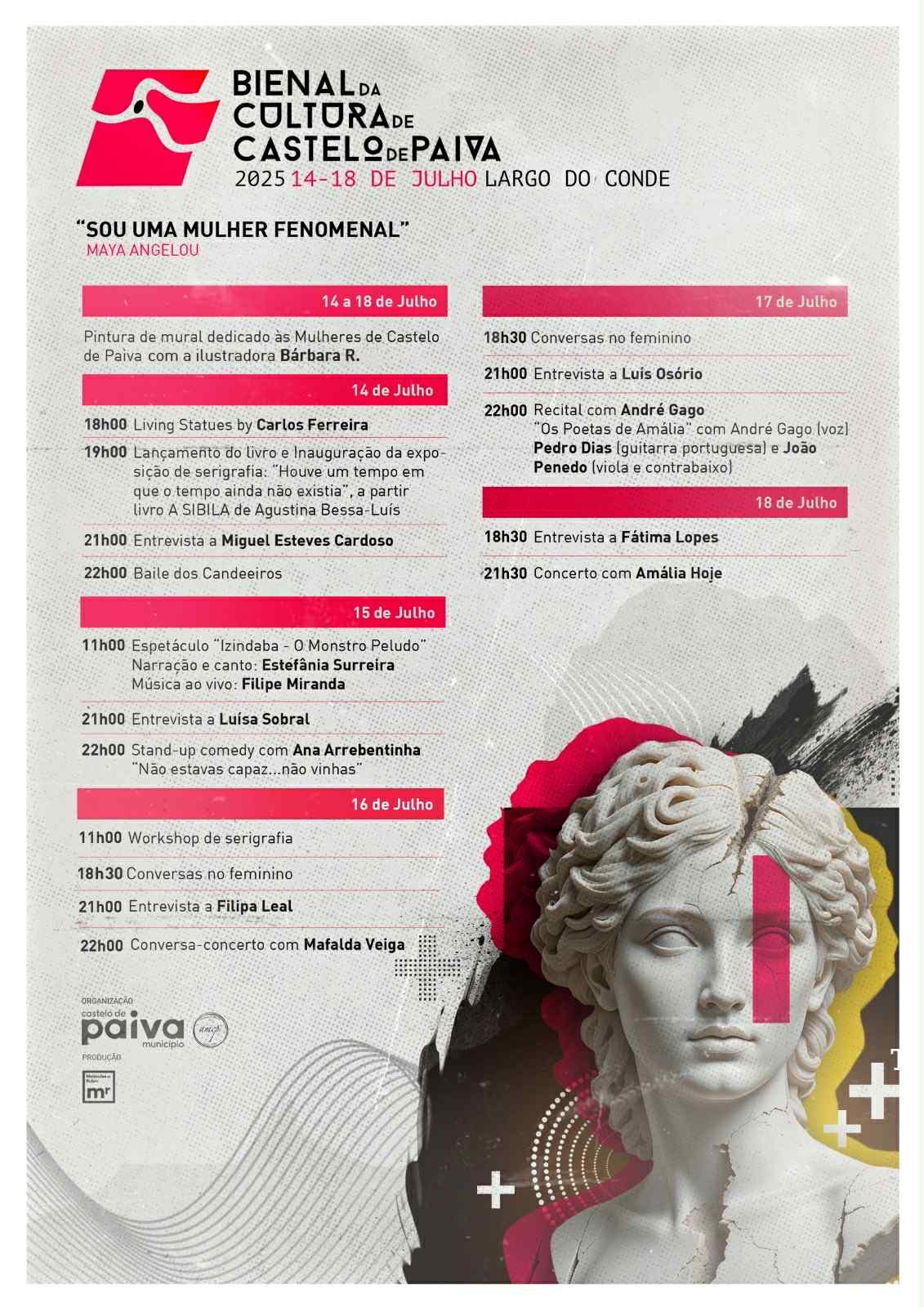O Município de Castelo de Paiva vai promover, entre os dias 14 e 18 de julho, a 4.ª edição da Bienal da Cultura, sob o tema “Sou uma mulher fenomenal”. A iniciativa, promovida pela Câmara Municipal, visa reforçar a ligação entre tradição, criatividade e expressão artística, num programa diversificado que integra música, dança, teatro, poesia e arte urbana, com atividades abertas a toda a comunidade.