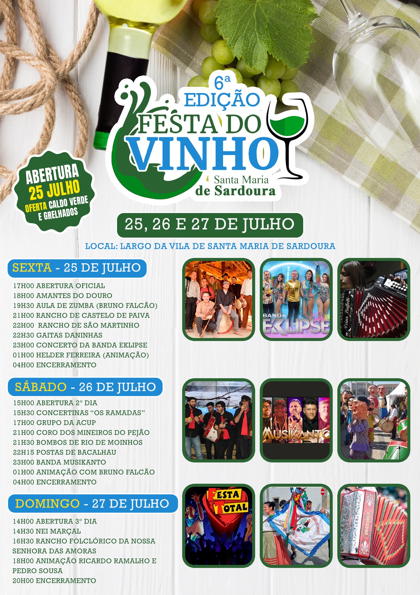 A freguesia de Santa Maria de Sardoura volta a acolher, a partir de hoje e até domingo, a 6.ª edição da Festa do Vinho, Gastronomia e Atividades, uma iniciativa da Junta de Freguesia que conta com o apoio da Câmara Municipal de Castelo de Paiva.