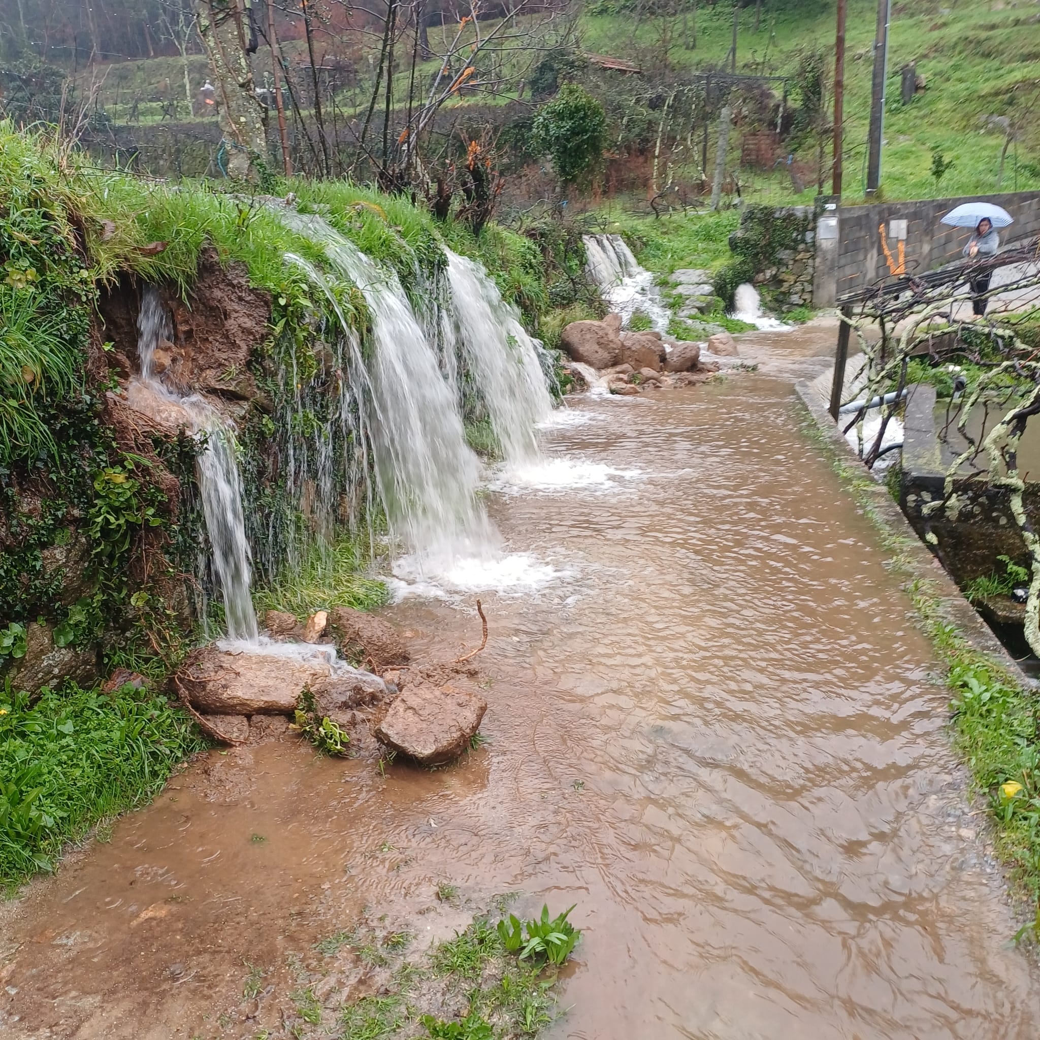 Como se observa na imagem, o fluxo formou várias quedas de água ao longo do talude e percorreu a via, cobrindo parte do pavimento. Apesar da ocorrência, não há registo de feridos.